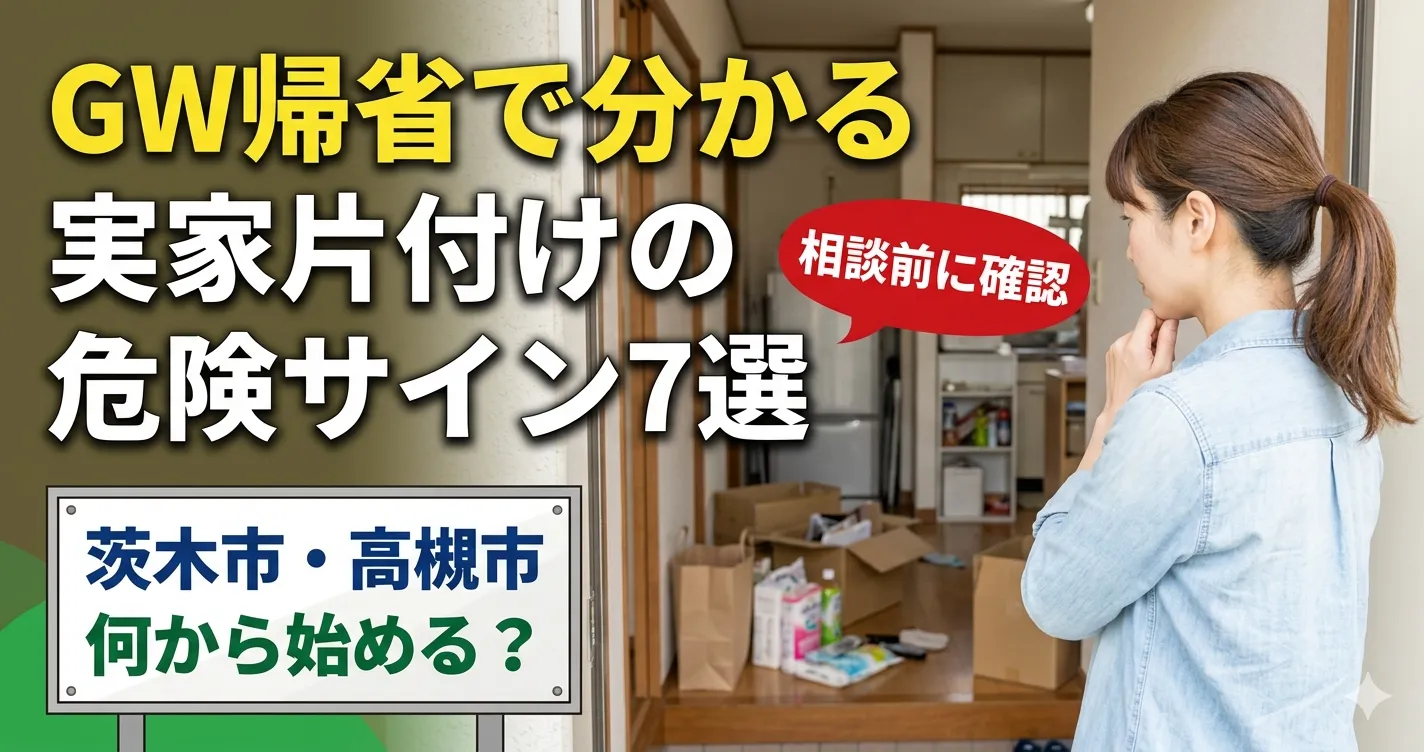 この記事では、GW帰省で確認したい実家片付けの危険サイン7選と、家族で揉めずに進めるコツ、どの段階でプロに相談した方が進めやすいのかを、茨木市・高槻市の現場目線でわかりやすく解説します。